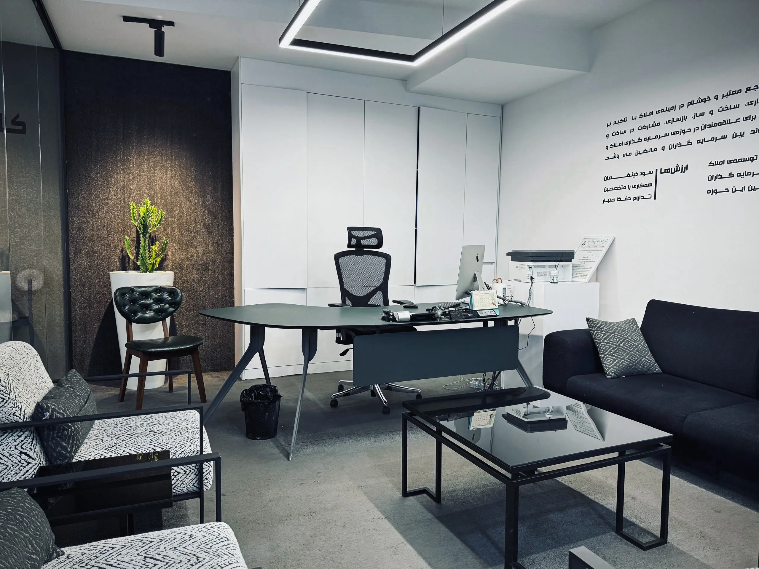 هر جزئیاتی در این محیط، از میز کار اصلی تا مبلهای پذیرایی و دکور ساده اما هدفمند، باعث داشتن آرامش خاطر و ایجاد فضایی منسجم برای تصمیمهای مهم و آینده ساز میشود.