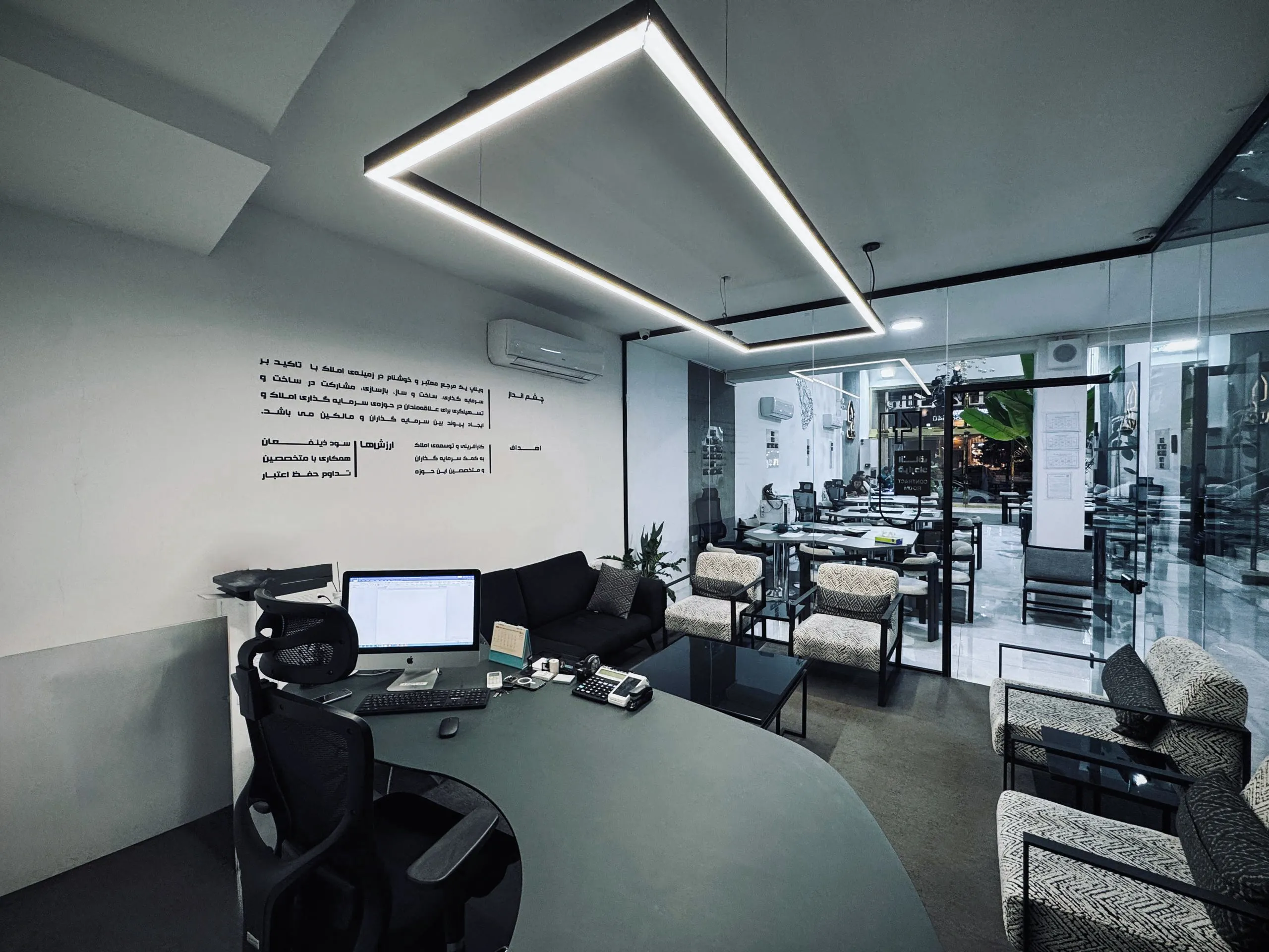 این فضا با نورپردازی مدرن و شیک، تجربه ای مطمئن از مشاوره املاک و قراردادهای حرفهای فراهم میکند.